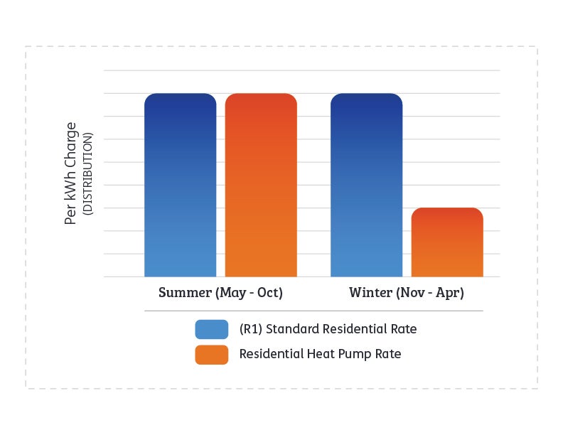 This rate class gives customers using heat pumps a reduced distribution rate during the winter months (November to April). You can benefit from this rate if your monthly usage in the winter is higher than the average Standard Residential Rate (R1) customer because you are heating your home with a heat pump. Even if you are only using a heat pump to partially heat your home, you may benefit from being on the Residential Heat Pump Rate.